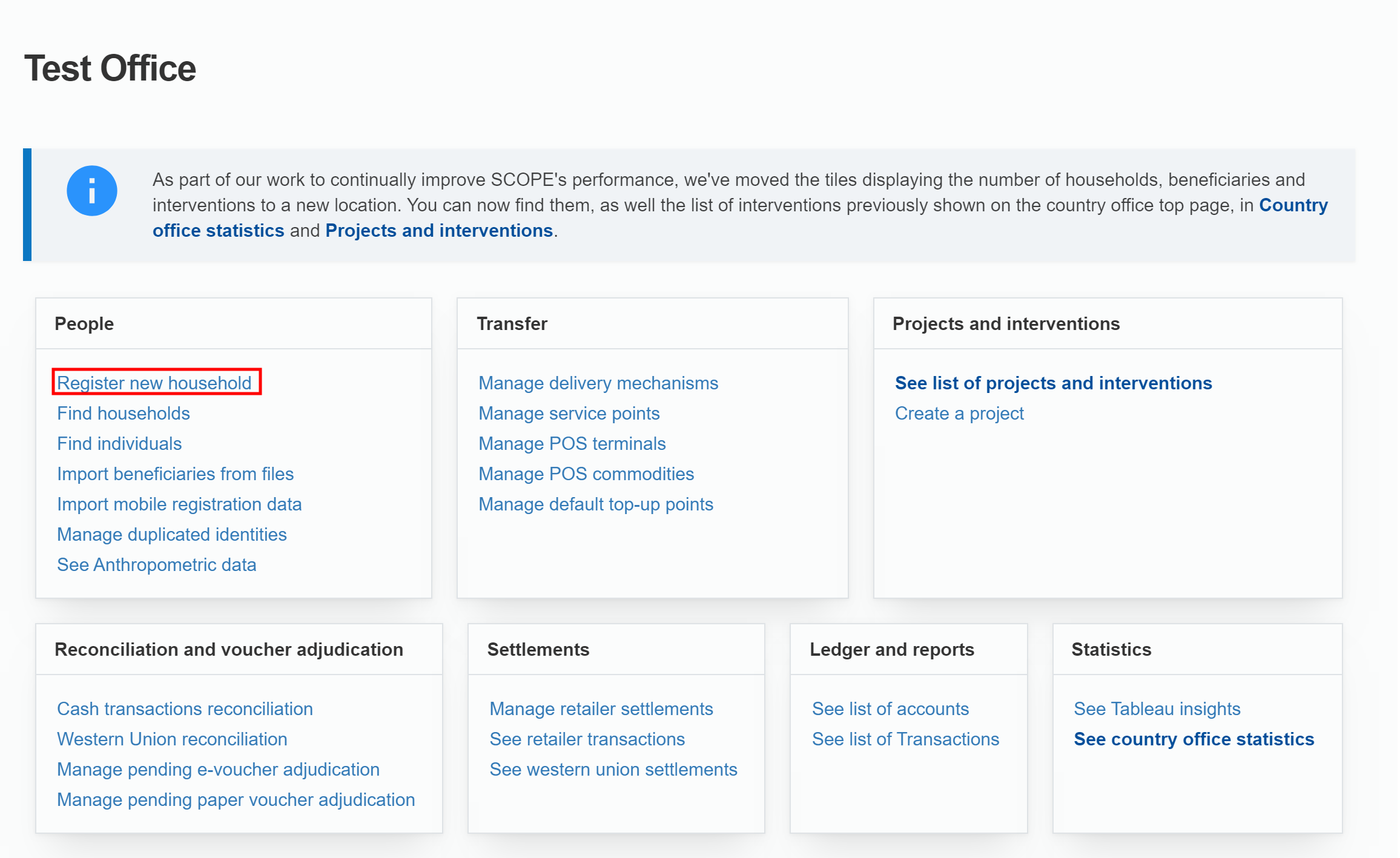 Registering households online is used to register households and individuals identities when you have internet access to SCOPE. All households and household members are registered directly to the SCOPE database.