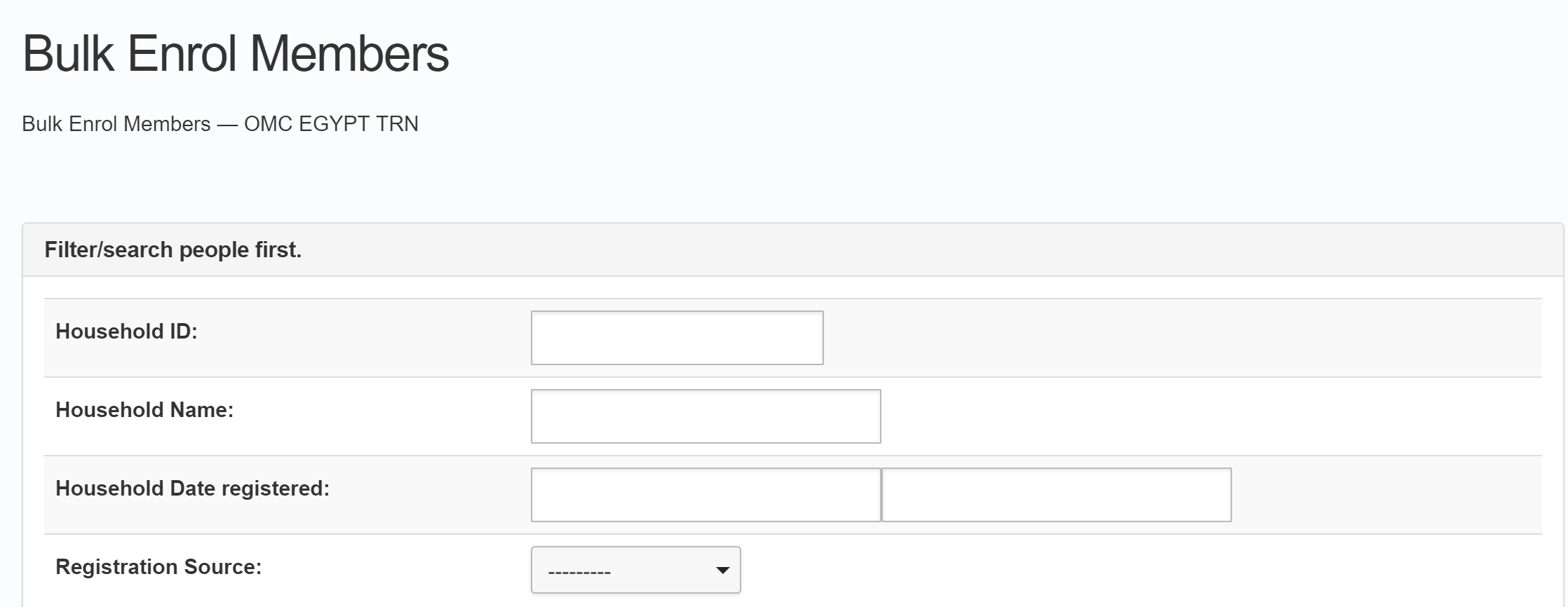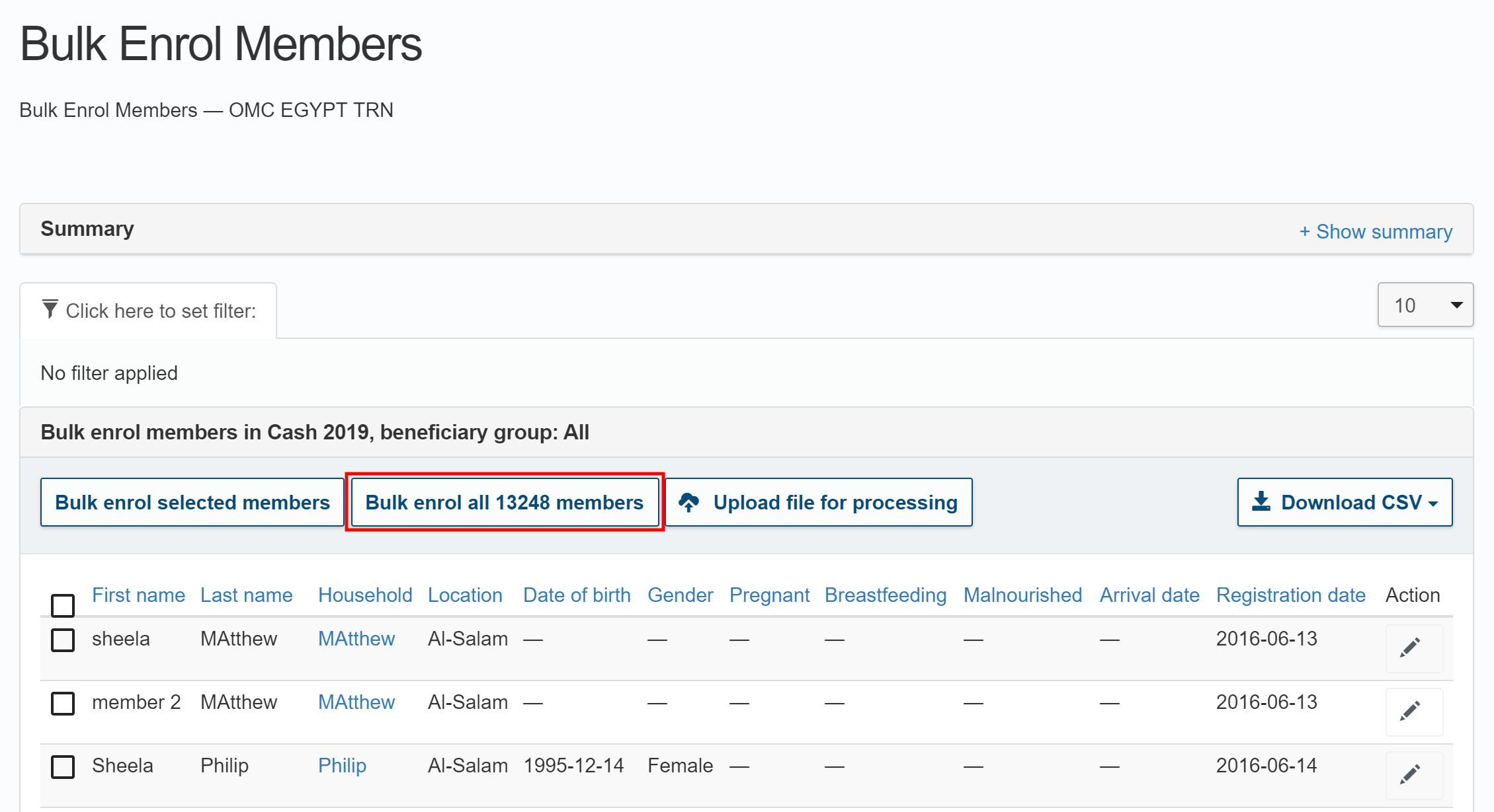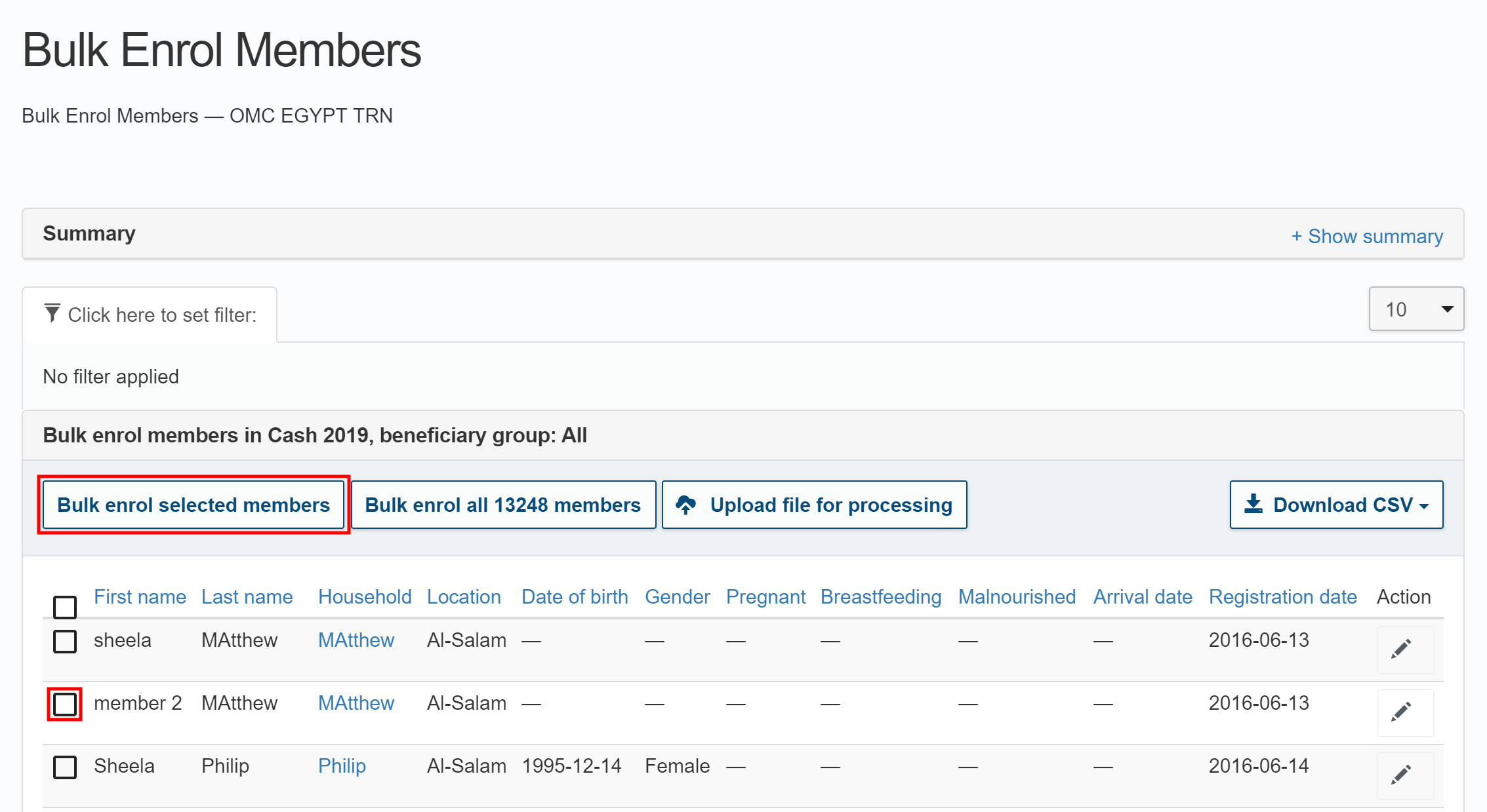 - Bulk Enrol Members allows you to enrol several beneficiaries at the same time. This method makes it easy to enrol multiple beneficiaries and allows you to filter selected groups of beneficiaries according to filter criteria. For example, you can use the age filter to enrol children in an intervention for children under 5. This method allows you to also use a CSV file to enrol beneficiaries.