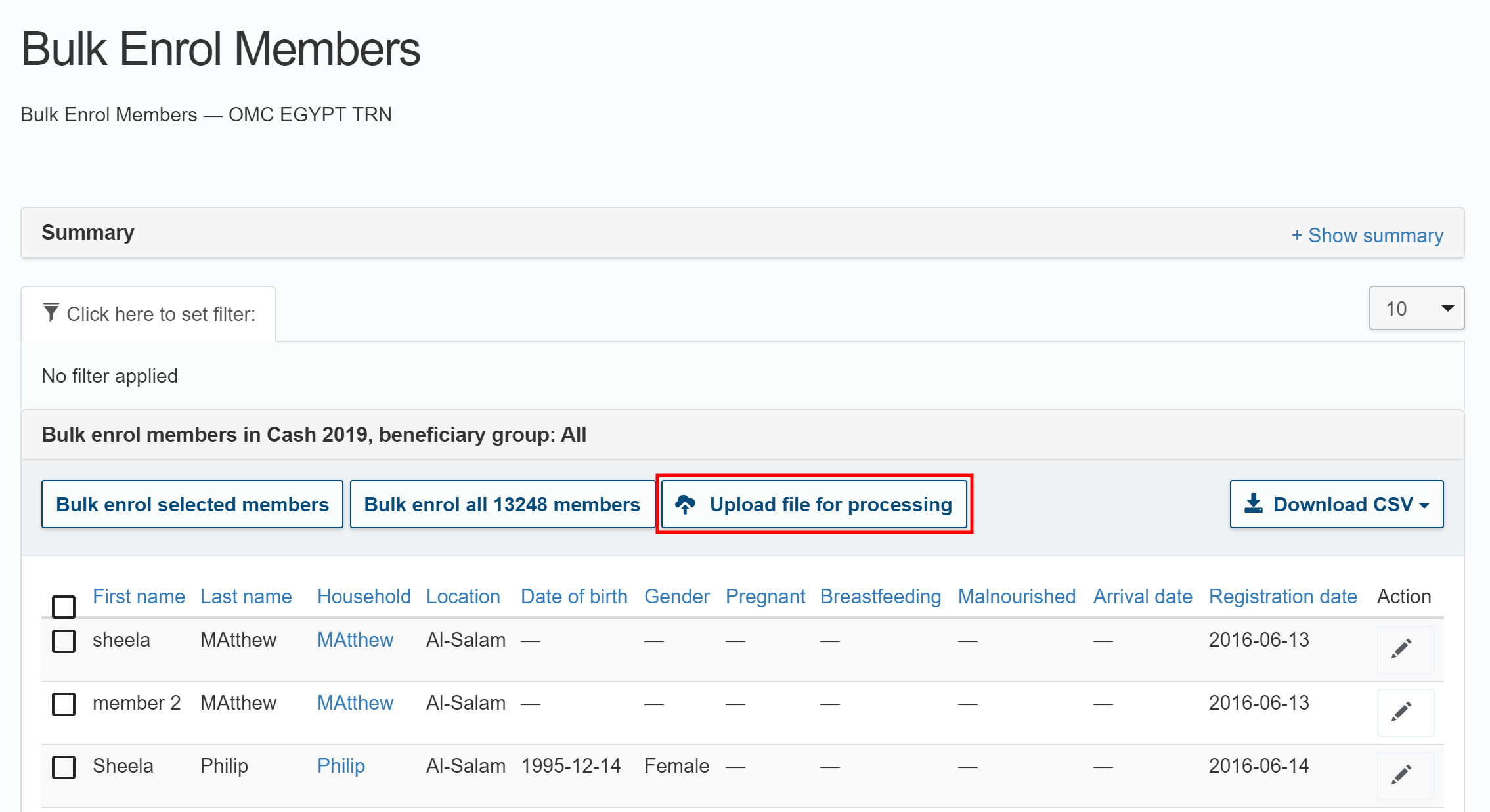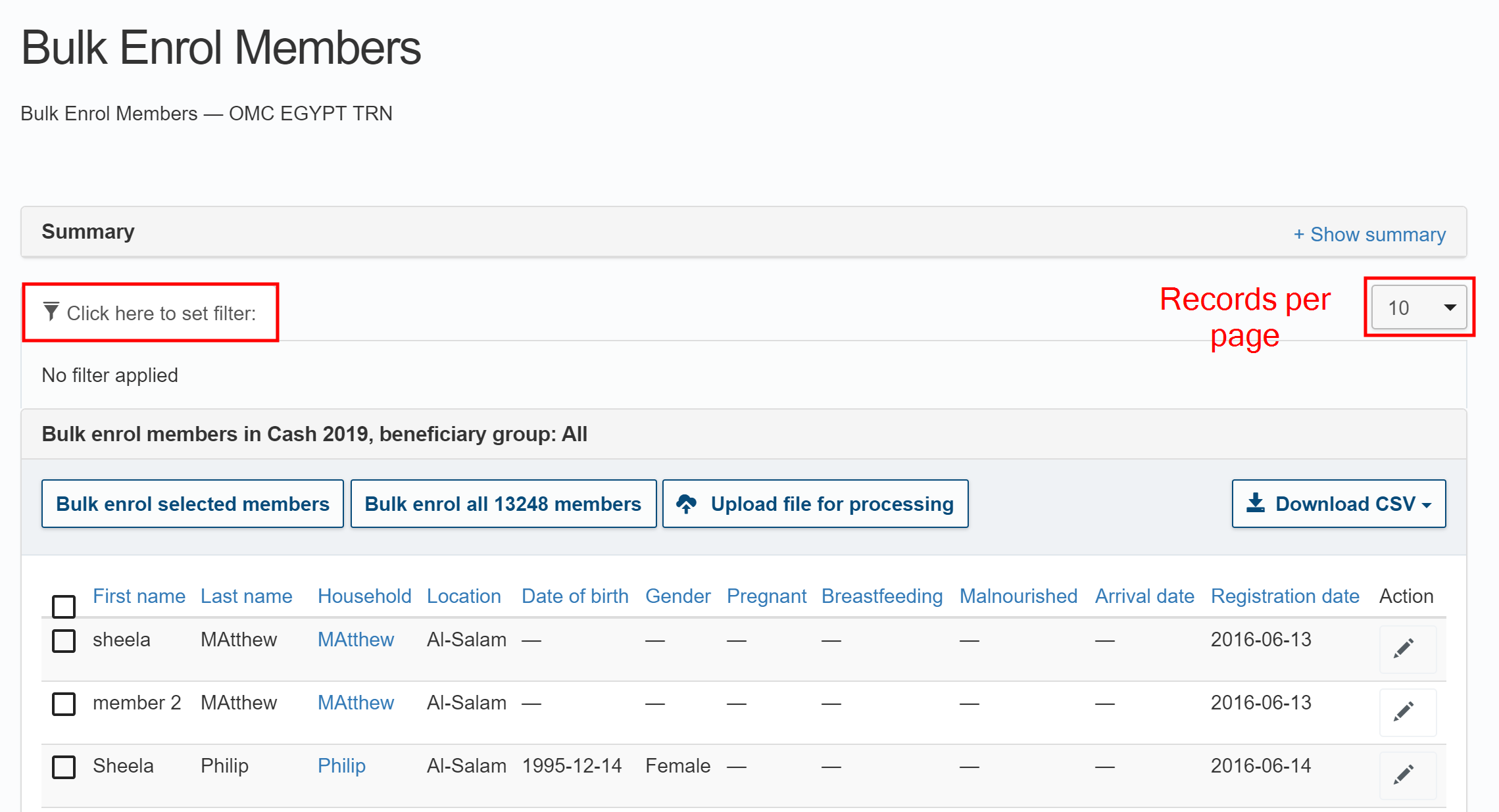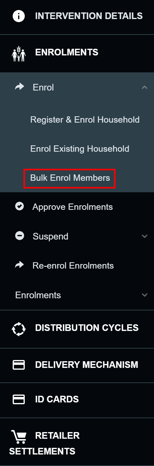 - Bulk Enrol Members allows you to enrol several beneficiaries at the same time. This method makes it easy to enrol multiple beneficiaries and allows you to filter selected groups of beneficiaries according to filter criteria. For example, you can use the age filter to enrol children in an intervention for children under 5. This method allows you to also use a CSV file to enrol beneficiaries.