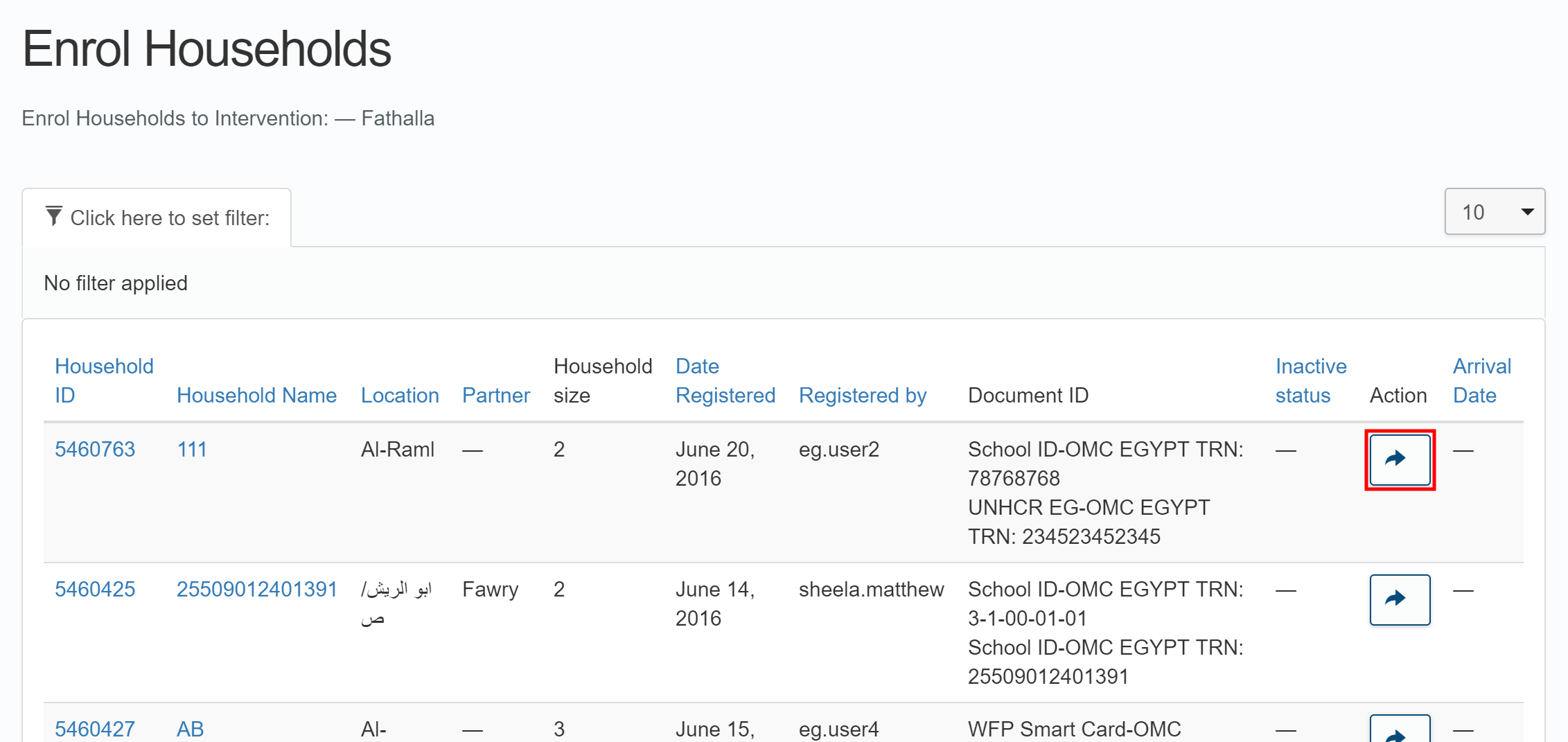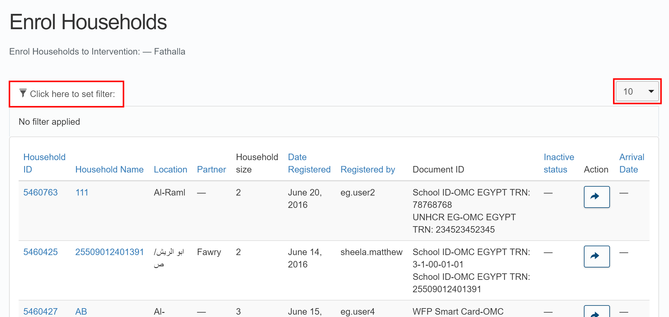 - In the Enrol Households page, find the households you want to enrol. By default, all households are listed with 10 households displayed on each page.