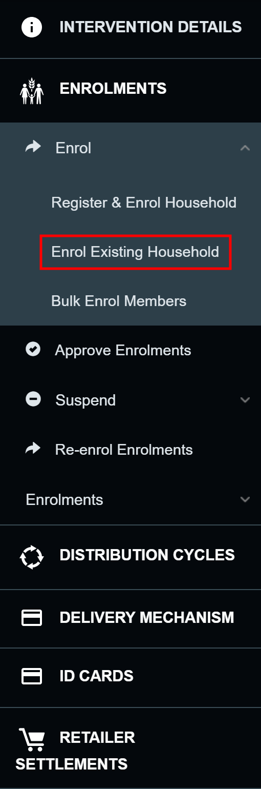 - Enrol Existing Household allows you to enrol and examine one household at a time and then enrol each household member according to their beneficiary group. This process takes longer to complete.