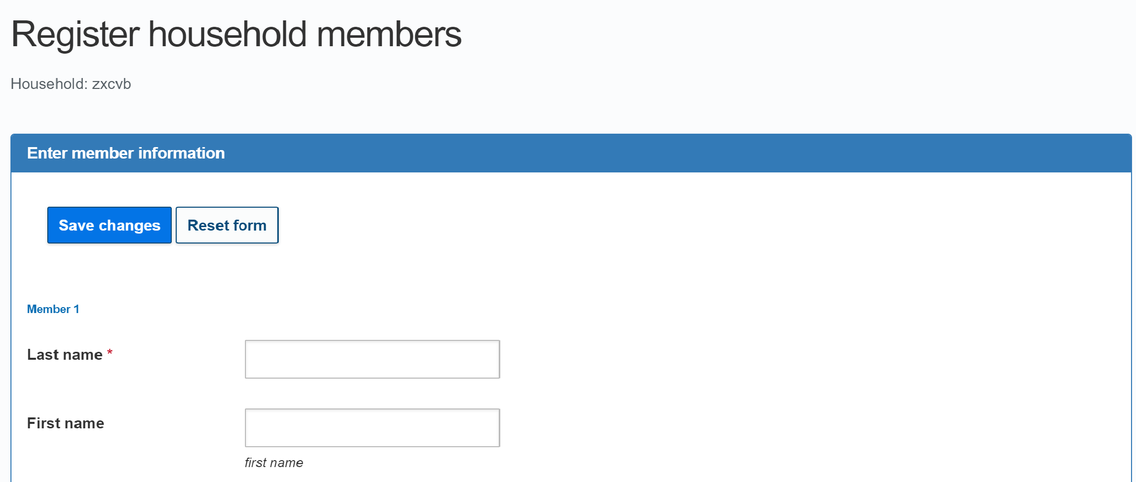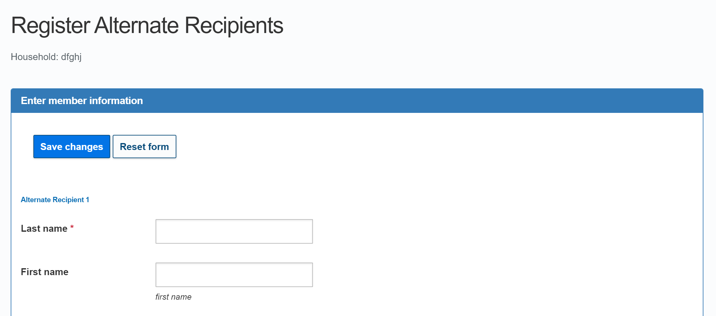Note: If you have set multiple alternate recipients for the household, you must complete the Register Alternate Recipients page for each alternate recipient. When you click , the next Register Alternate Recipients page will be displayed for the next alternate recipient. Once you have completed a Register Alternate Recipients page for each alternate recipient, the Register household member page is displayed instead.