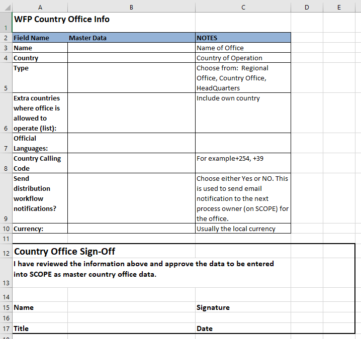 Master data is used by the SCOPE Service Desk (SSD) to set up a Country Office and it is essential that this data is correct. SCOPE master data includes the following information about a Country Office:
