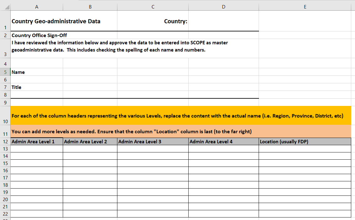 Note: This must be done correctly. Projects and interventions are based on the locations you enter here. If mistakes are made here, it is difficult to correct them later. SSD will need to manually correct all the data, and errors may cause issues with existing projects and interventions. Ensure that VAM (or relevant alternate colleagues) have approved all of the administrative areas and locations before you complete this sheet.
