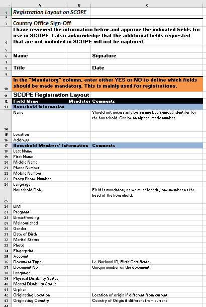 Decide which fields are required for registration of households and household members at your Country Office. If you need to add more fields, add them to the end of the list. In the Mandatory column of the table in the Registration Layout in SCOPE sheet, enter "YES" or "NO" to define which fields are mandatory.