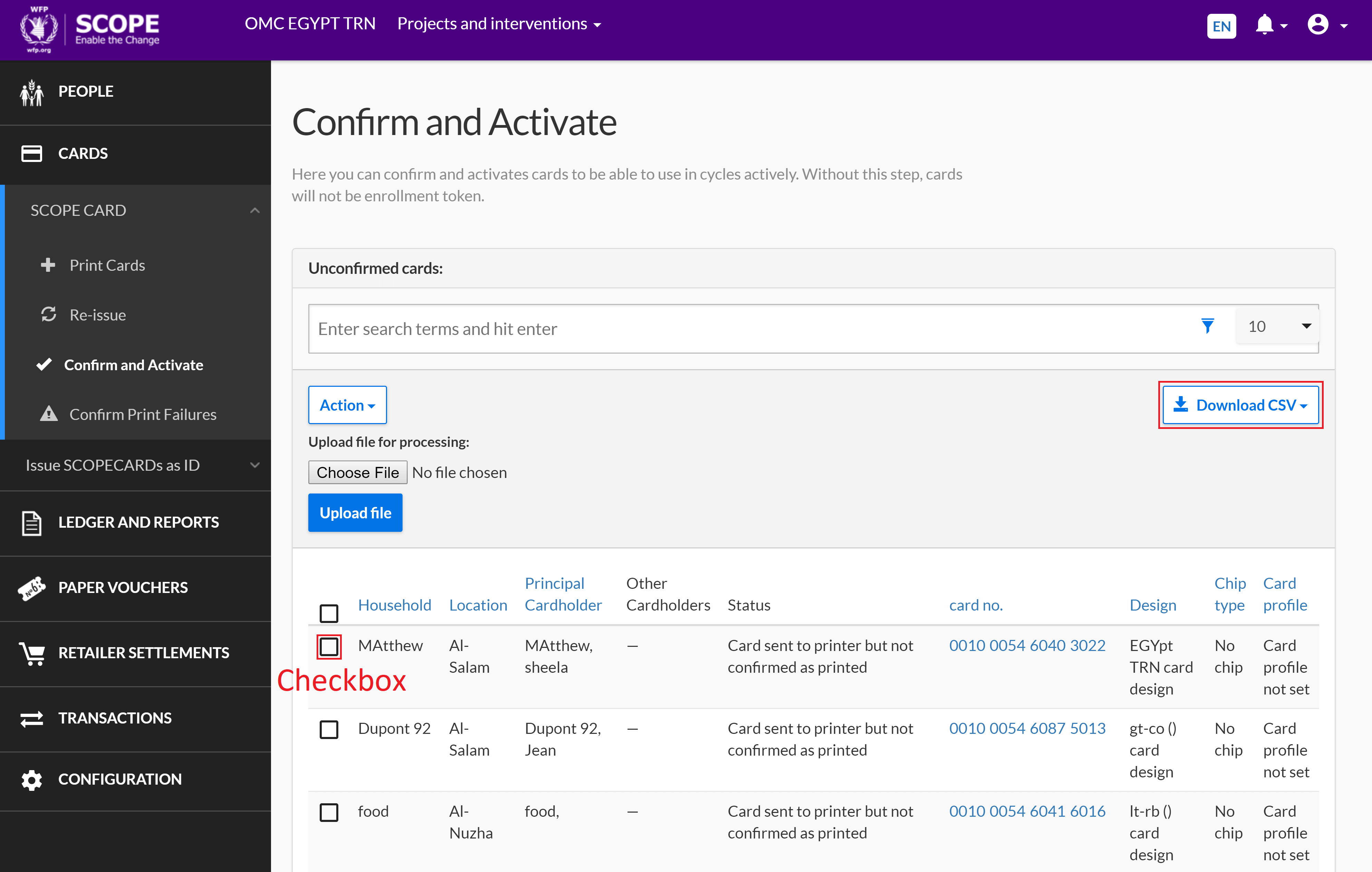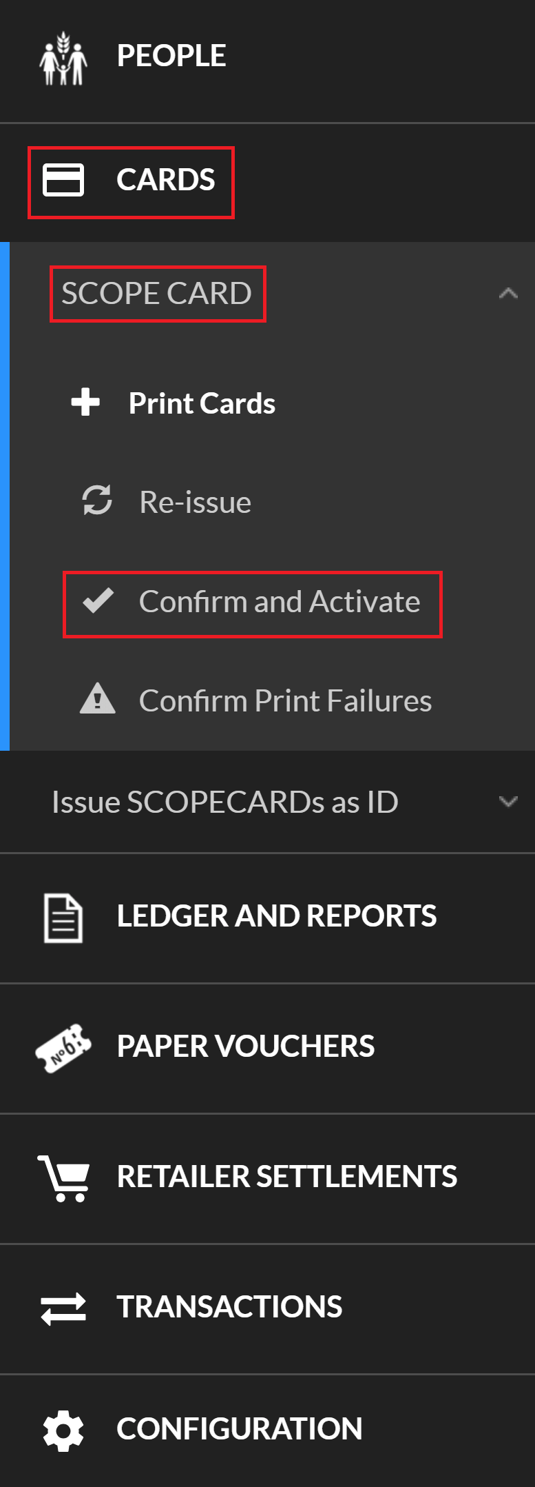 Confirm and activate printed SCOPECARDs so they can be actively used in a distribution cycle. If SCOPECARDs are not confirmed and activated, they cannot be used as an enrolment token.