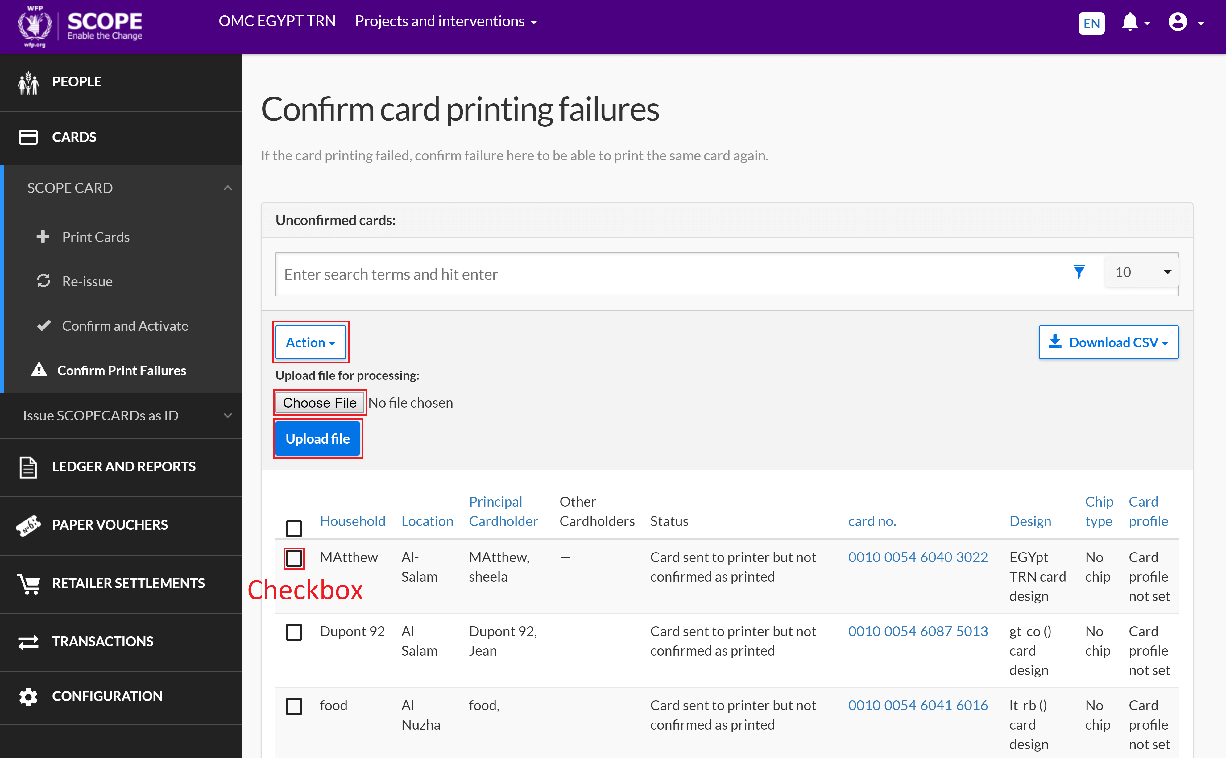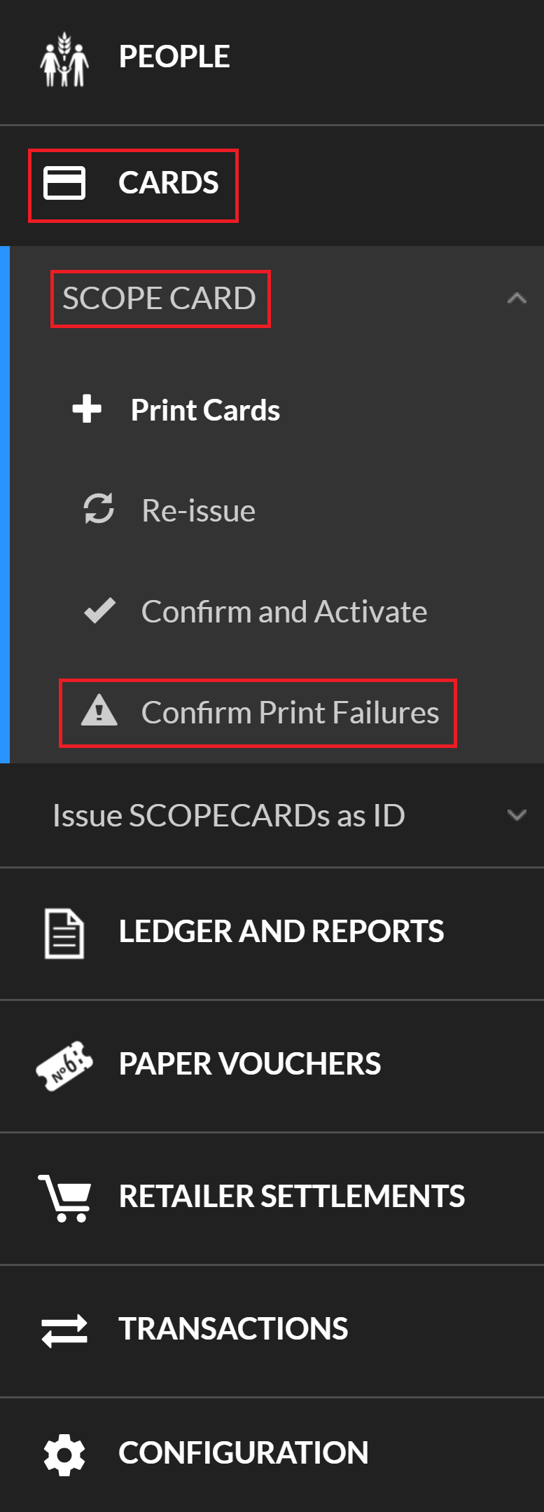 Note: You can only confirm print failures for WFPWorld Food Programme barcode-ID cards if you have selected them as the token type for a delivery mechanism and the SCOPE user interface will change to reflect this.