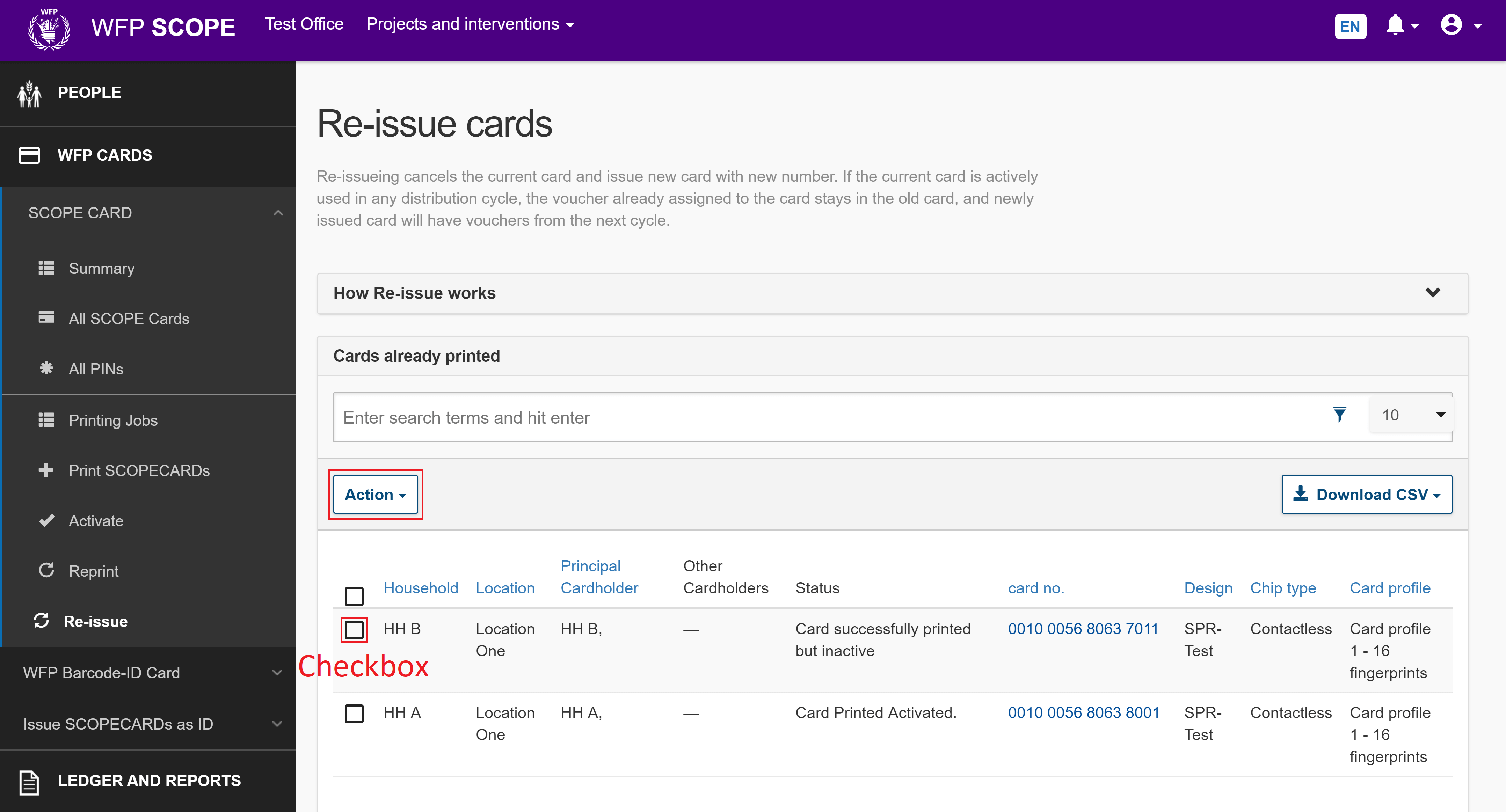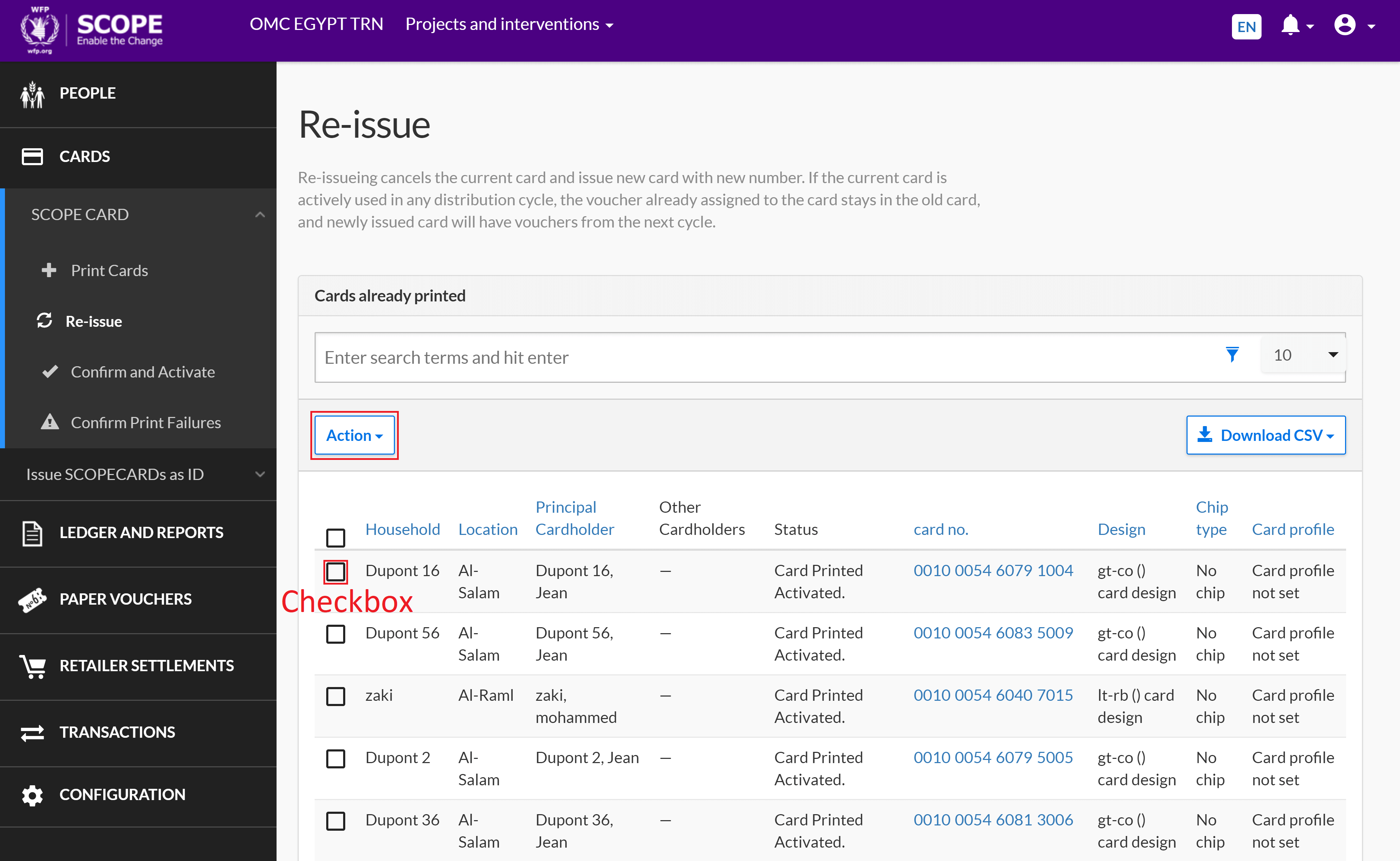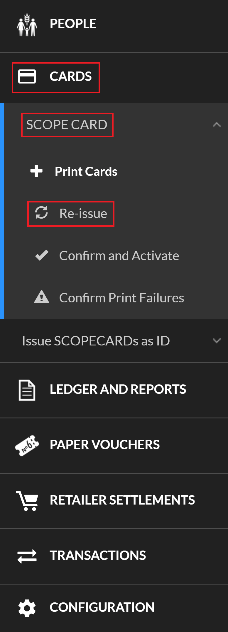 Select SCOPECARDs to cancel and re-issue, for example, if they have been lost or stolen. Re-issuing creates a new SCOPECARD with a new number and cancels the current SCOPECARD for a beneficiary. If a card is cancelled while it is being actively used in a distribution cycle, any vouchers assigned to it will remain assigned. Vouchers will be assigned to the newly issued SCOPECARD beginning with the next distribution cycle.