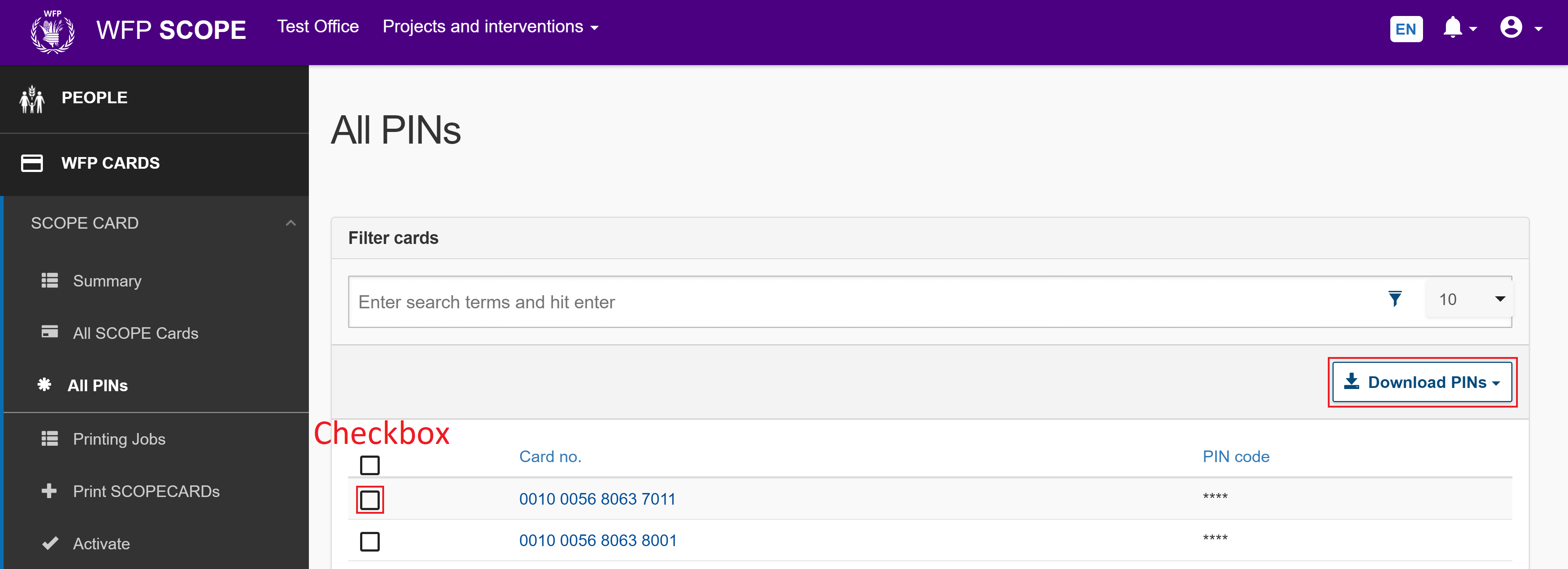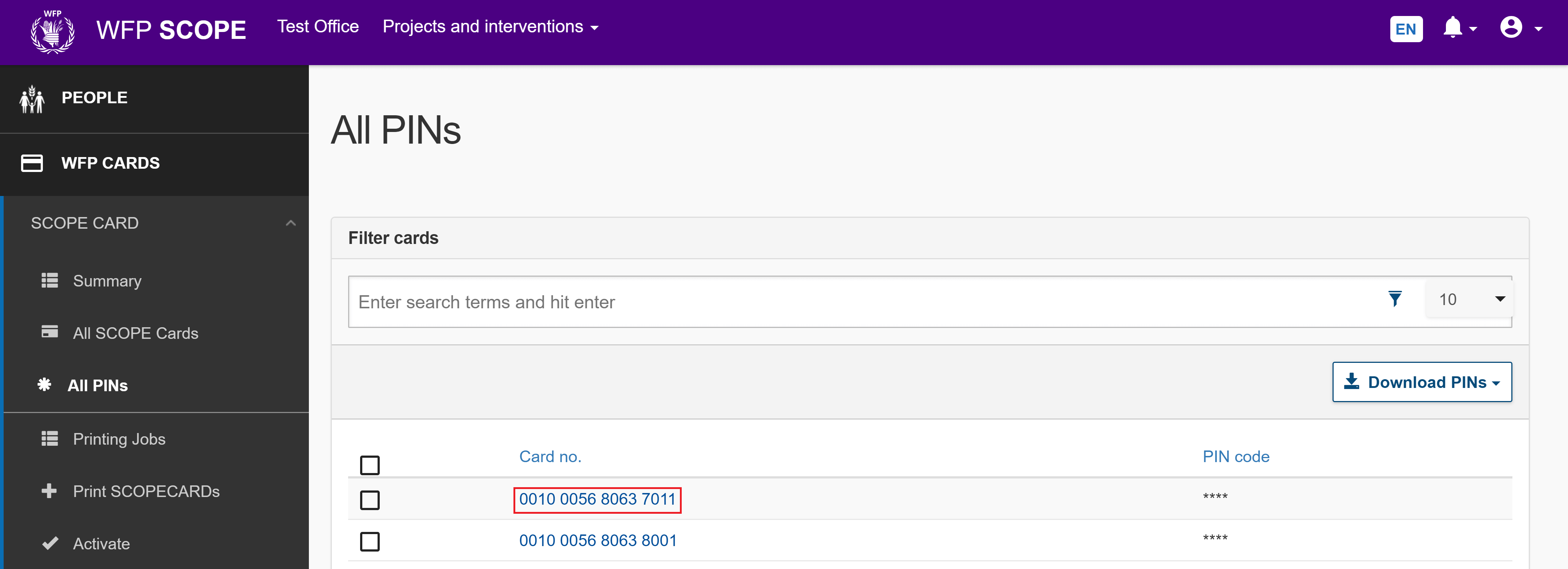 Download the PIN (personal identification number) for any SCOPECARD as a CSV file.