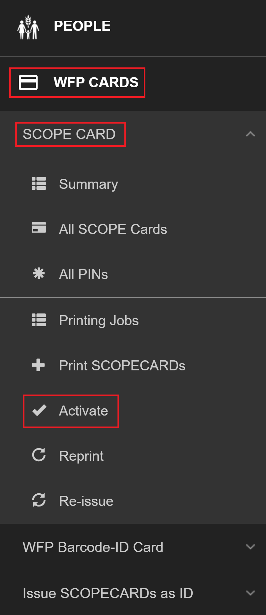 Note: You can only confirm and activate WFPWorld Food Programme barcode-ID cards if you have selected them as the token type for a delivery mechanism and the SCOPE user interface will change to reflect this.