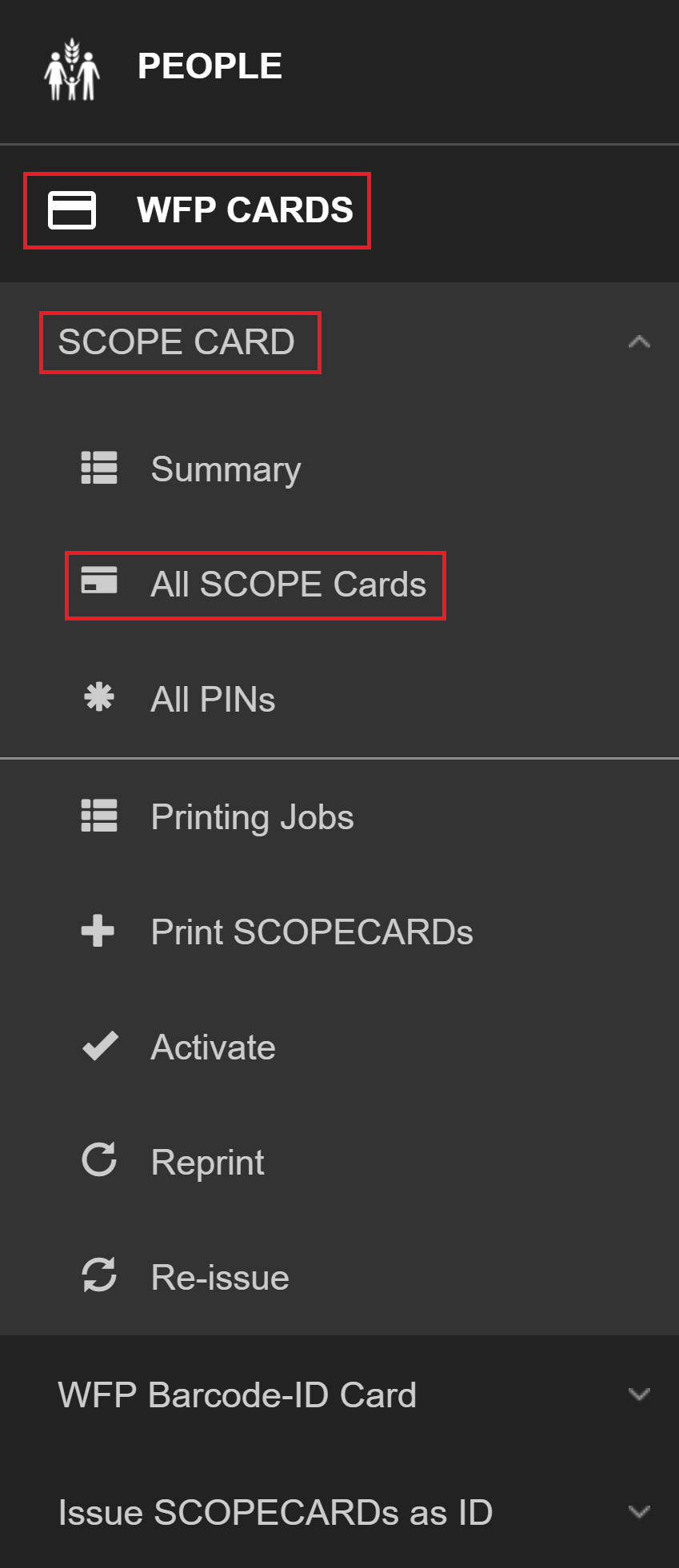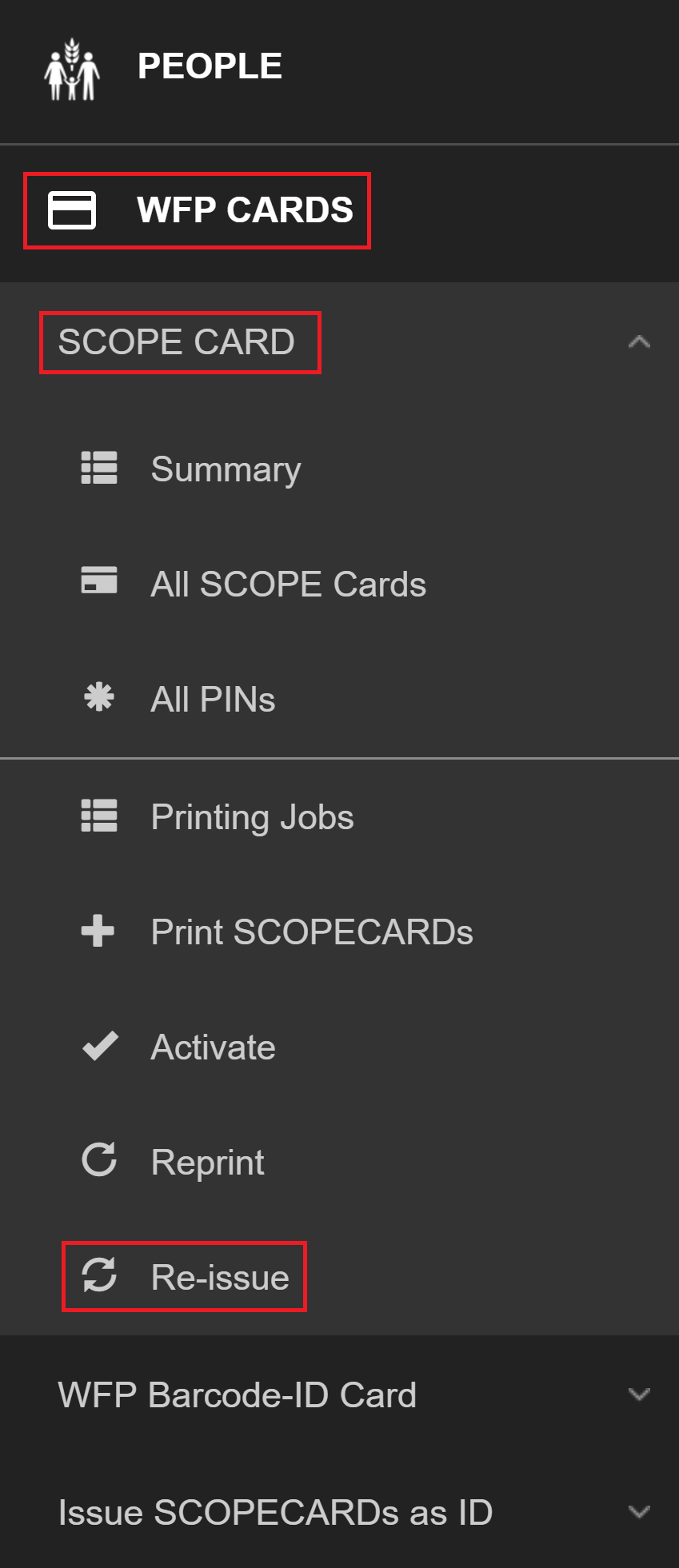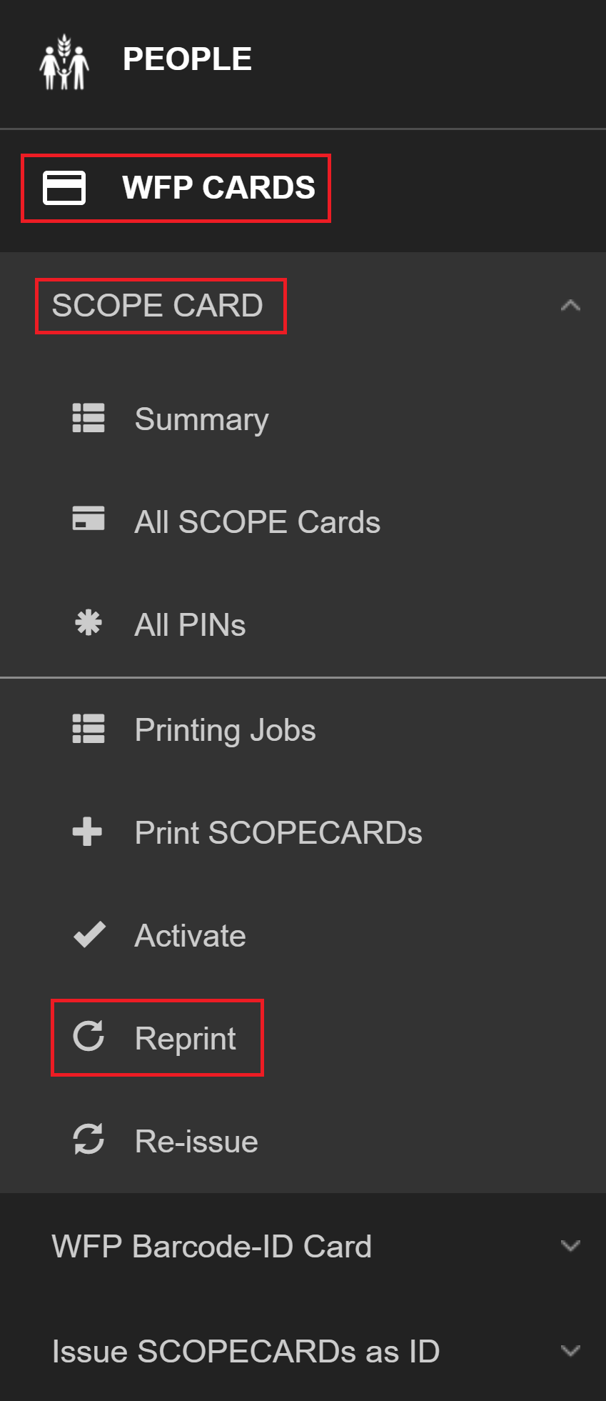 Note: You can only re-issue WFPWorld Food Programme barcode-ID cards if you have selected them as the token type for a delivery mechanism and the SCOPE user interface will change to reflect this.