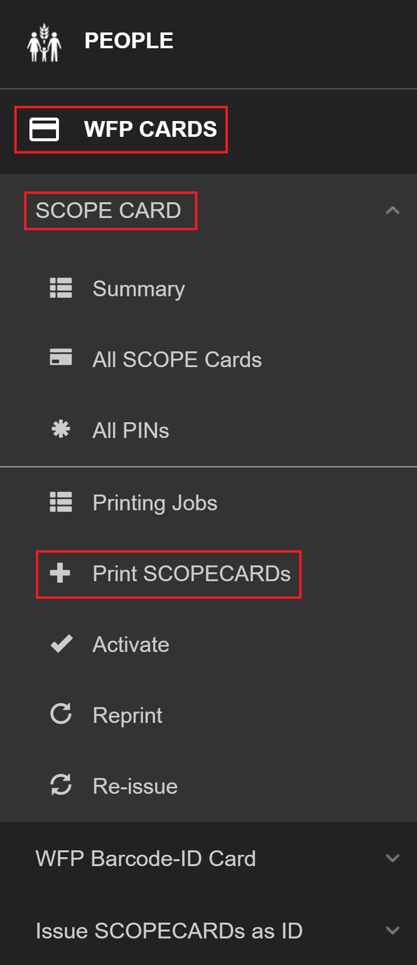 Note: You can only print WFPWorld Food Programme barcode-ID cards if you have selected them as the token type for a delivery mechanism and the SCOPE user interface will change to reflect this.