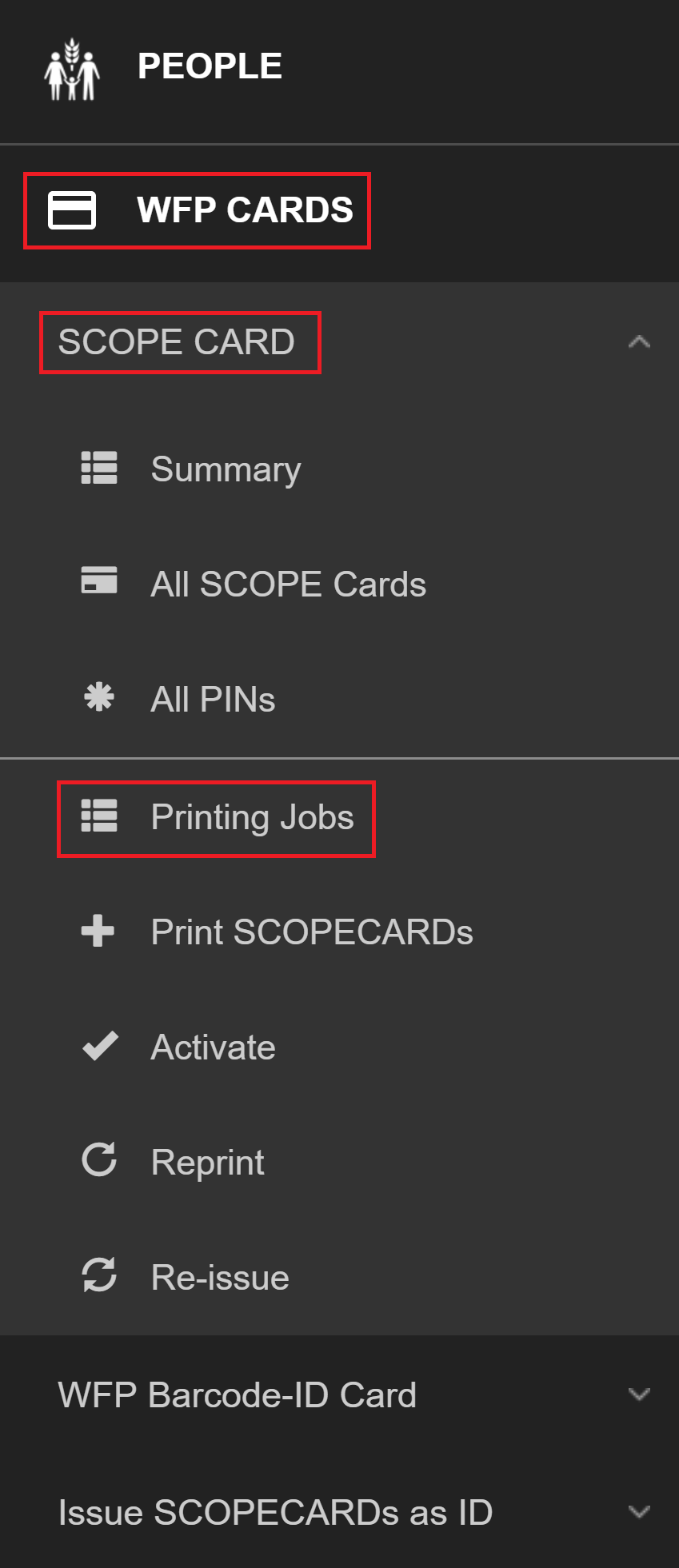 You can manage WFPWorld Food Programme barcode-ID card printing by performing the following actions: