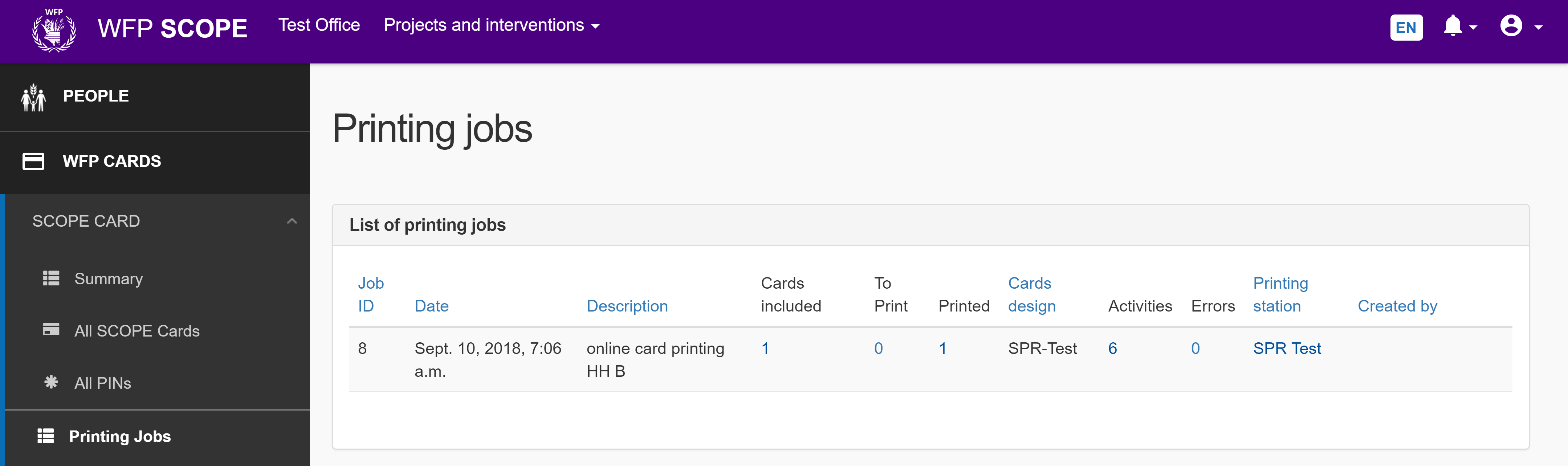 A list of all SCOPECARD printing jobs is displayed in the Printing jobs page.